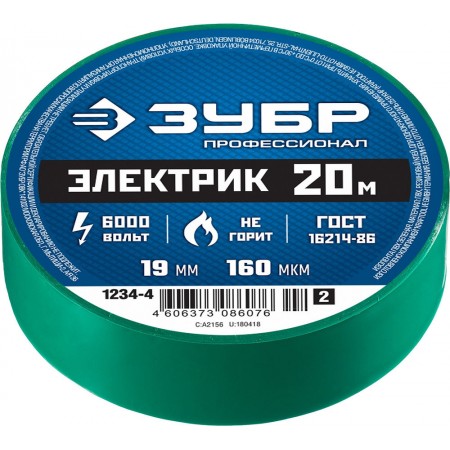 Изолента ПВХ ЭЛЕКТРИК-20 19 мм x 20 м, 6000 В, зеленая, не поддерживает горение ЗУБР Профессионал 1234-4_z02