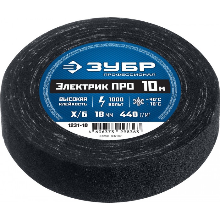 Изолента х/б ЭЛЕКТРИК ПРО 18 мм x 10 м, 1000 В, черная ЗУБР Профессионал 1231-10