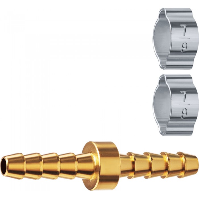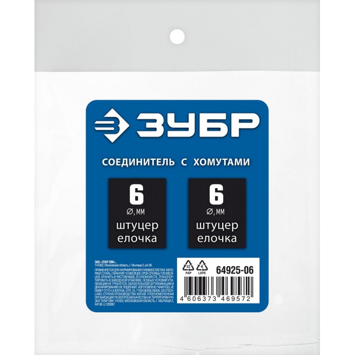 Штуцер соединительный «елочка»–«елочка» 6 мм с обжимными хомутами ЗУБР Профессионал 64925-06