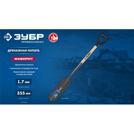 Лопата дренажная Фаворит 353 x 152 x 1120 мм, полотно 1.7 мм закалено, деревянный лакированный черенок высший сорт с рукояткой ЗУБР Профессионал 4-39515