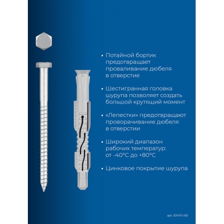 • Специально разработанные ″лепестки″ предотвращают проворачивание установленного дюбеля в отверстии.