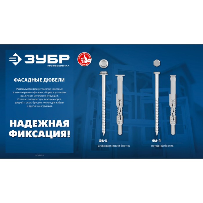 Фасадные дюбели используются при устройстве навесных и вентилируемых фасадов, сборке и установке различных металлоконструкций. С помощью фасадных дюбелей можно осуществлять монтаж ворот, дверей и окон, брусьев и лотков для кабеля к полнотелым строительным материалам (бетон, строительный камень, кирпич).