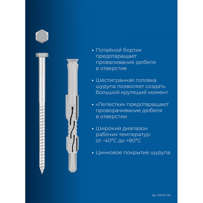 • Шестигранная головка шурупа позволяет создать большой крутящий момент при монтаже, обеспечивая дополнительную прочность соединения.