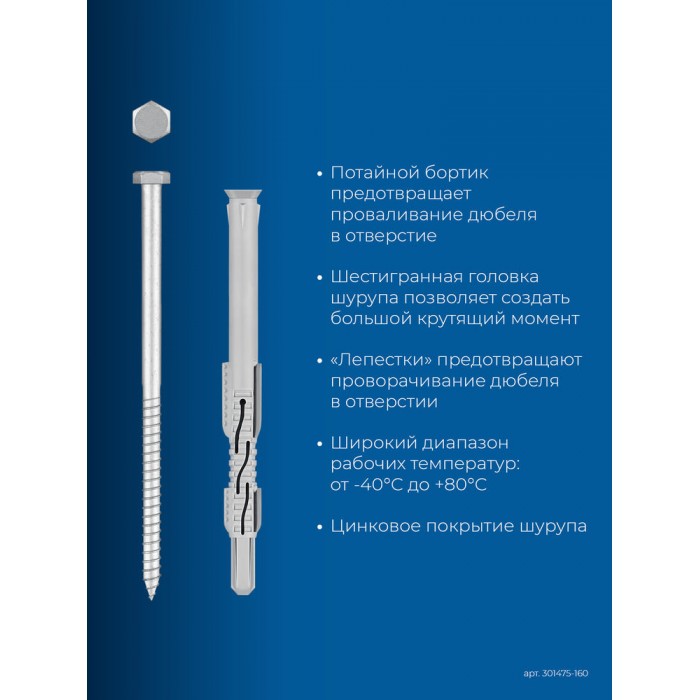 • Шестигранная головка шурупа позволяет создать большой крутящий момент при монтаже, обеспечивая дополнительную прочность соединения.