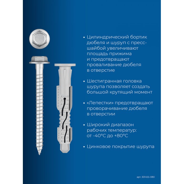 • Цилиндрический бортик дюбеля и шуруп с пресс-шайбой увеличивают площадь прижима фиксируемой детали, а также предотвращают проваливание дюбеля в отверстие.