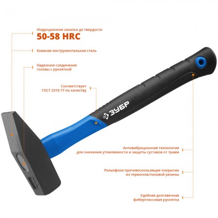 Молоток ЗУБР ПРОФЕССИОНАЛ оснащен особопрочной фибергласовой рукояткой. АВТ - технология позволяет существенно снизить вибрации, возникающие во время удара, что делает работу с инструментом более комфортной. Соответствует требованиям ГОСТ 2310-77.