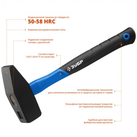 Молоток ЗУБР ПРОФЕССИОНАЛ оснащен особопрочной фибергласовой рукояткой. АВТ - технология позволяет существенно снизить вибрации, возникающие во время удара, что делает работу с инструментом более комфортной. Соответствует требованиям ГОСТ 2310-77.