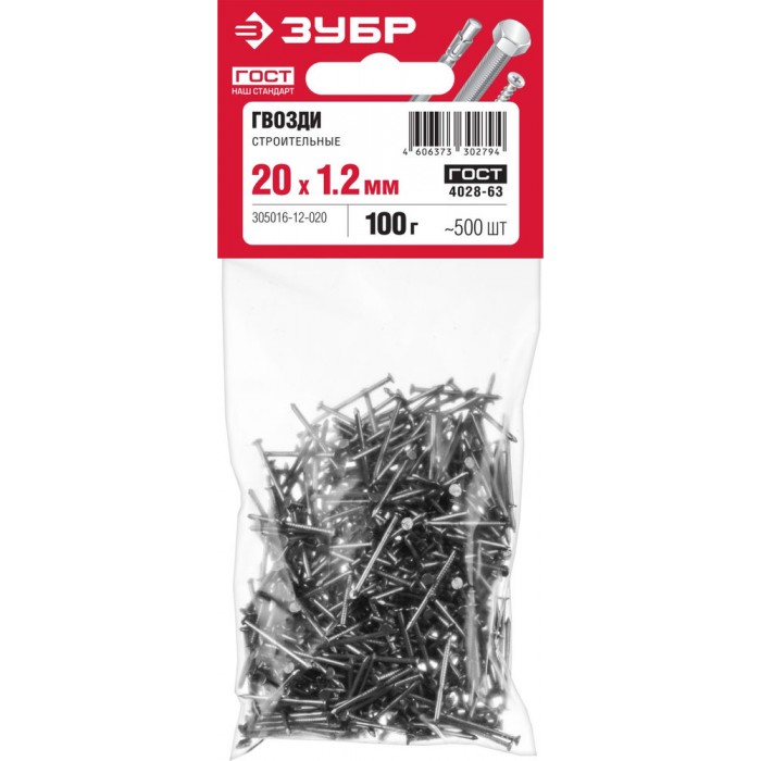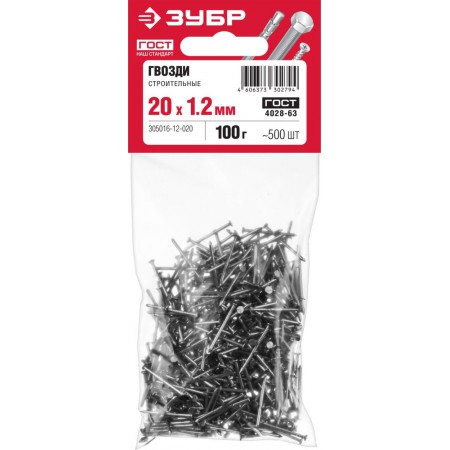 Гвозди строительные 20 x 1.2 мм, 100 г, ГОСТ 4028-63 ЗУБР 305016-12-020
