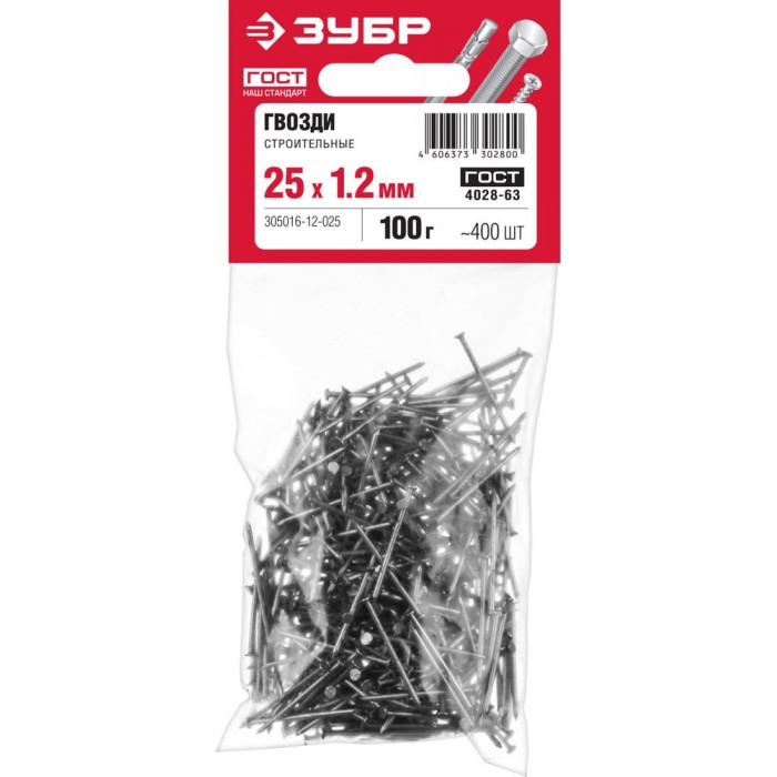 Гвозди строительные 25 x 1.2 мм, 100 г, ГОСТ 4028-63 ЗУБР 305016-12-025