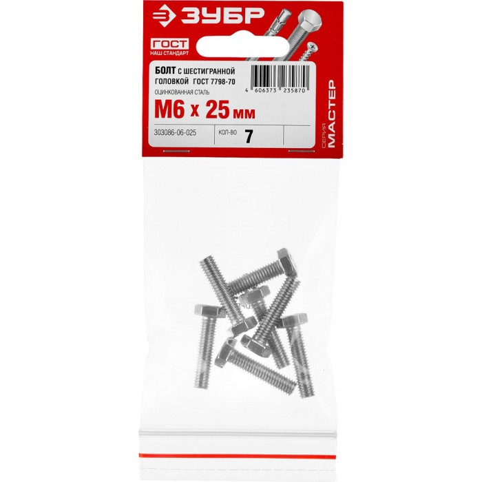 Болт M6 x 25 мм, кл. пр. 5.8, цинк, 7 шт, ГОСТ 7798-70 ЗУБР 303086-06-025