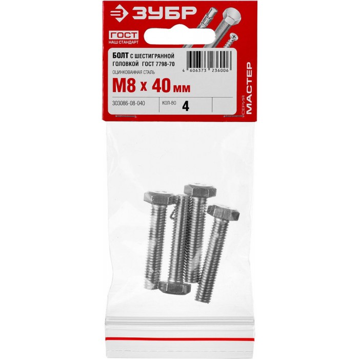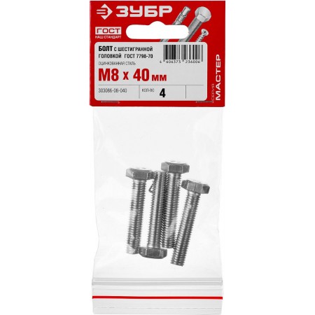 Болт M8 x 40 мм, кл. пр. 5.8, цинк, 4 шт, ГОСТ 7798-70 ЗУБР 303086-08-040