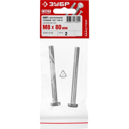 Болт M8 x 80 мм, кл. пр. 5.8, цинк, 2 шт, ГОСТ 7798-70 ЗУБР 303086-08-080