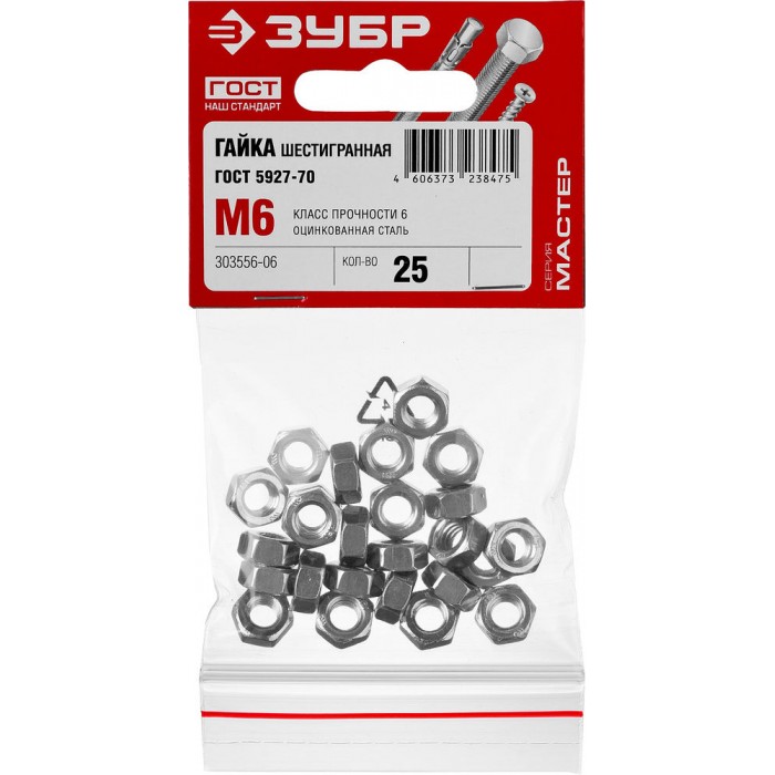 Гайка шестигранная M6, кл. пр. 6, цинк, 25 шт, ГОСТ ISO 4032-2014 ЗУБР 303556-06