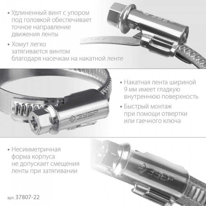 Червячный хомут состоит из штампованной ленты и винта с червячной резьбой. Накатная лента имеет гладкую внутреннюю поверхность, которая защищает шланг от повреждений. При вращении винта лента сжимается, благодаря чему создается надежное и герметичное соединение шлангов, различных труб, и т.д. Червячный винт снабжен шестигранной головкой под ключ 8 мм и шлицем PH, что позволяет использовать при монтаже гаечный ключ или шлицевую отвертку.