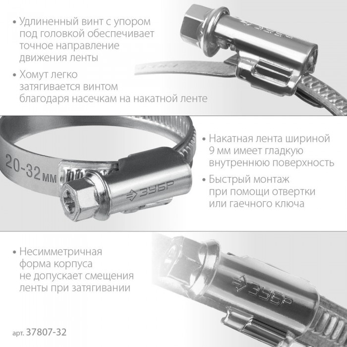 Хомут червячный Х-9Н 20 - 32 мм, накатная лента 9 мм, цинк, 50 шт ЗУБР 37807-32