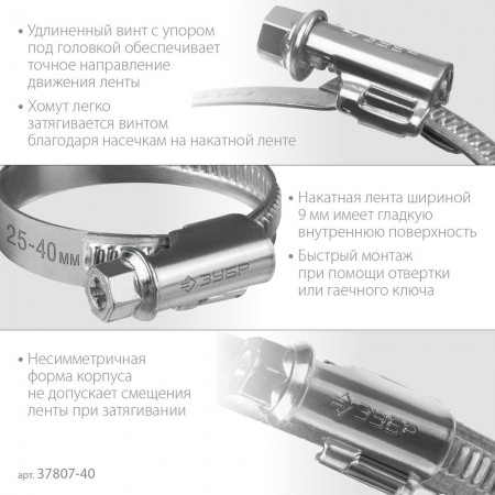 Хомут червячный Х-9Н 25 - 40 мм, накатная лента 9 мм, цинк, 50 шт ЗУБР 37807-40