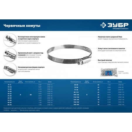 Червячный хомут состоит из штампованной ленты и винта с червячной резьбой. Накатная лента имеет гладкую внутреннюю поверхность, которая защищает шланг от повреждений. При вращении винта лента сжимается, благодаря чему создается надежное и герметичное соединение шлангов, различных труб, и т.д. Червячный винт снабжен шестигранной головкой под ключ 8 мм и шлицем PH, что позволяет использовать при монтаже гаечный ключ или шлицевую отвертку.