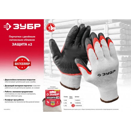 Перчатки х/б х2 ЗАЩИТА с двойным латексным обливом, повышенной износостойкости, 13 класс, 10 пар, размер L-XL ЗУБР 11459-K10
