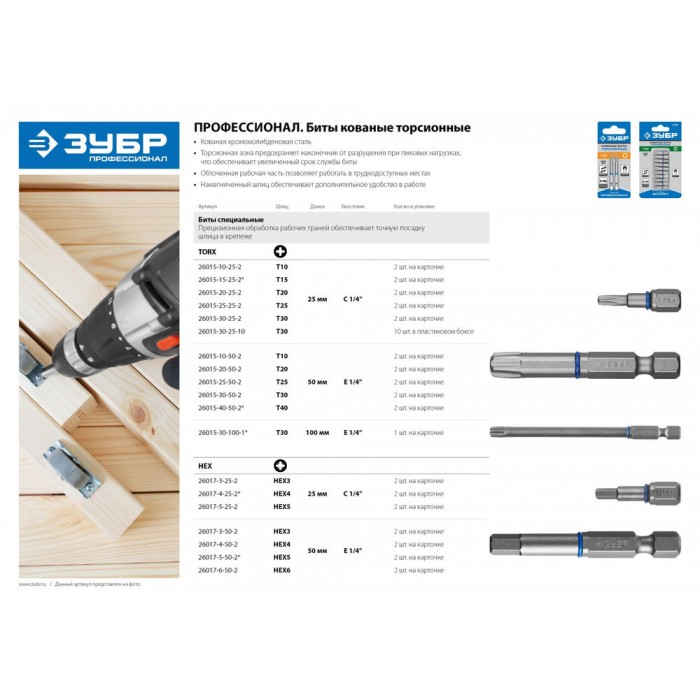 Профессиональные биты ЗУБР серии «ЭКСПЕРТ», предназначенные для ин-дустриального применения, имеют тор-сионную зону, предохраняющую нако-нечник от разрушения при пиковых нагрузках. Используются с ручным и механизированным инструментом.