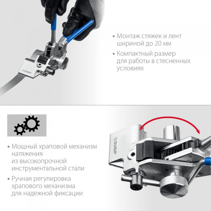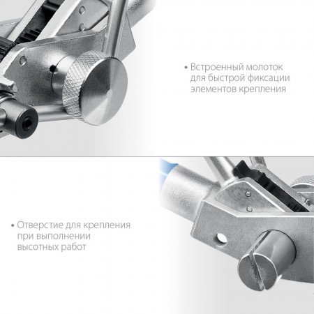 Инструмент 2в1 для затяжки стальных лент предназначен для быстрой и надёжной стяжки и обрезки. Ширина затягиваемых металлических лент до 20 мм. Цельнометаллический корпус с защитным покрытием. Усиленный нож для обрезки ленты.