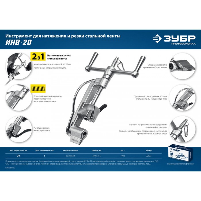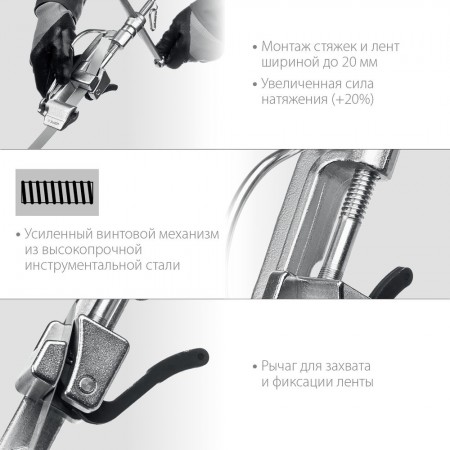 Инструмент 2в1 для затяжки стальных лент предназначен для быстрой и надёжной стяжки и обрезки. Специальный нож для обрезки ленты. Ширина затягиваемых металлических лент до 20 мм. Цельнометаллический корпус с защитным покрытием. Усиленное лезвие.