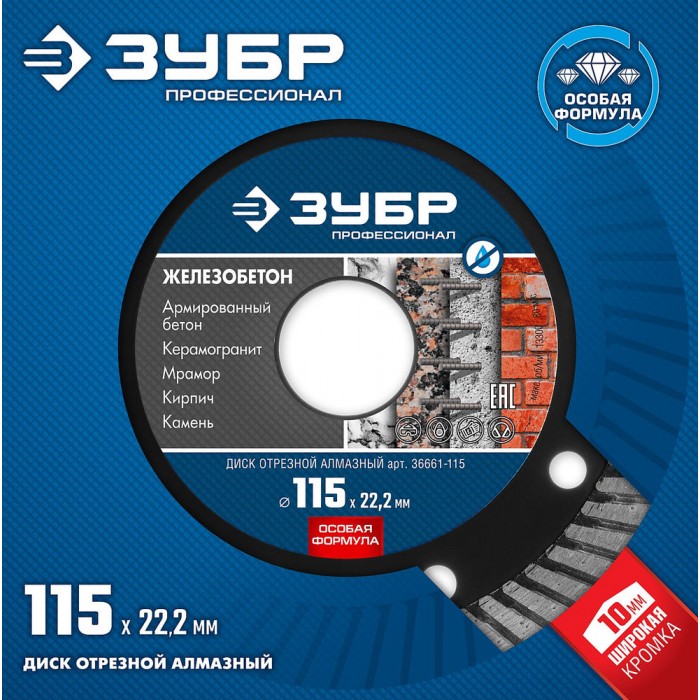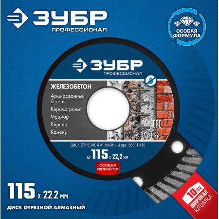 Диск алмазный сегментированный по железобетону 115 мм, 22.2 мм, 10 x 2.4 мм ЗУБР Железобетон Профессионал 36661-115