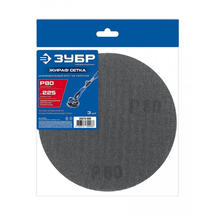 Круг шлифовальный сетчатый на липучке Жираф СЕТКА 225 мм, Р80, 3 шт ЗУБР Профессионал 35675-080