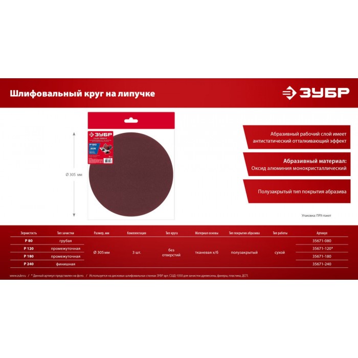 Шлифовальный круг на липучке 305 мм, Р80, 3 шт ЗУБР СШД-1050-К 35671-080