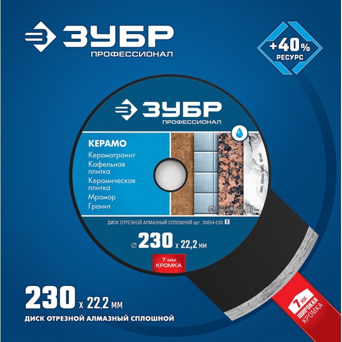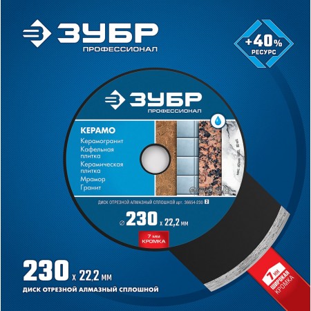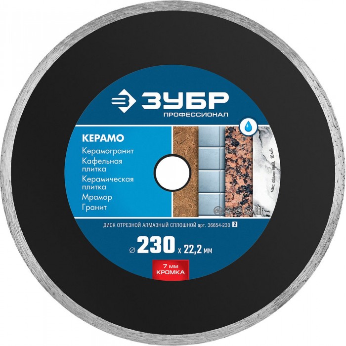 Диск алмазный сплошной Керамо-22 d 230 мм, 22.2 мм, 7 x 2.4 мм ЗУБР Профессионал 36654-230_z02