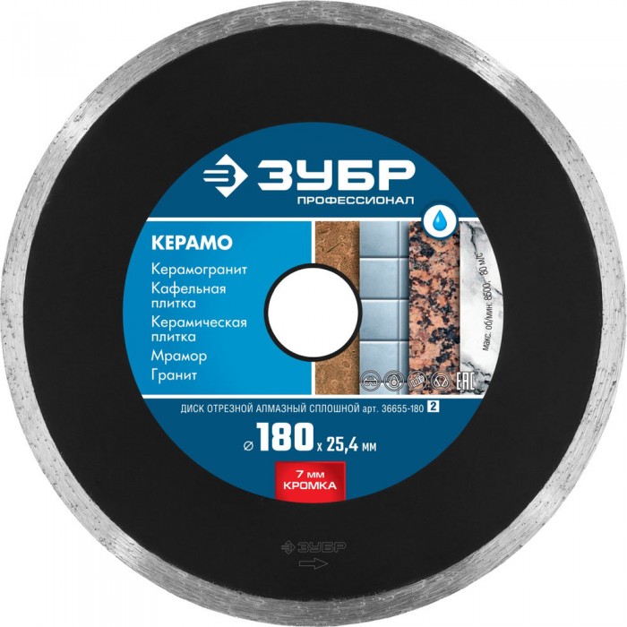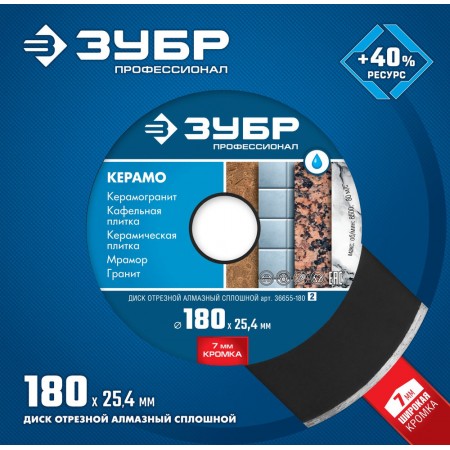 Диск алмазный сплошной Керамо-25 d 180 мм, 25.4 мм, 7 x 2.2 мм ЗУБР Профессионал 36655-180_z02