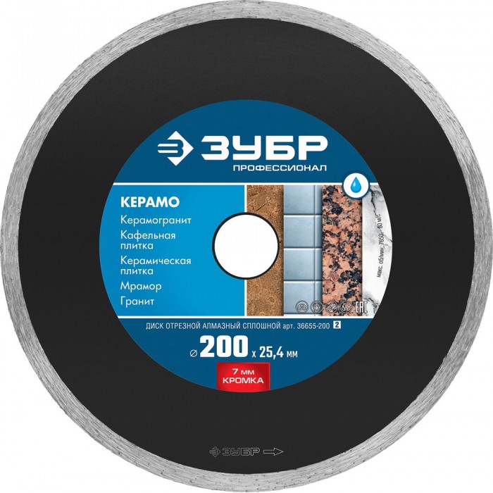 Диск алмазный сплошной Керамо-25 d 200 мм, 25.4 мм, 7 x 2.2 мм ЗУБР Профессионал 36655-200_z02