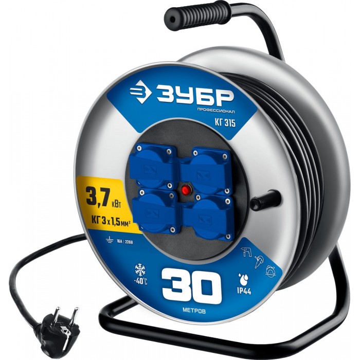 Удлинитель силовой на стальной катушке КГ-315 КГ 3 x 1.5 мм2, 30 м, 3700 Вт, IP44 ЗУБР Профессионал 55080-30_z01