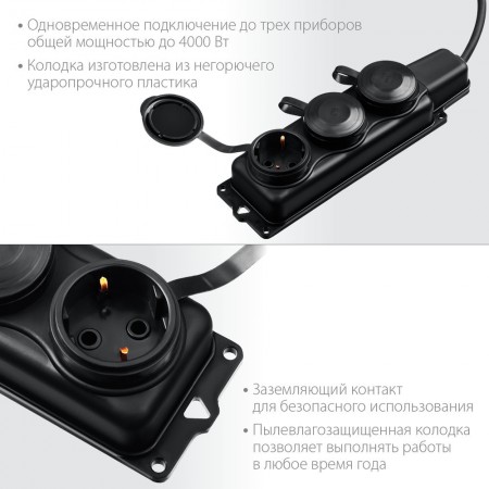 Удлинитель предназначен для подключения электрических приборов, которые находится на удалении от основного источника сети. Провод КГ (резиновая изоляция) устойчив к низким температурам до -40°С, к агрессивным средам, к деформациям и ударам. Позволяет выполнять работы в любое время года.