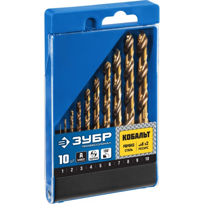Набор сверл по металлу 10 шт (1-10 мм), сталь Р6М5К5, класс А Кобальт ЗУБР Профессионал 29626-H10_z01