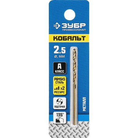 Сверло по металлу 2.5 х 57 мм, сталь Р6М5К5, класс А Кобальт ЗУБР Профессионал 29626-2.5