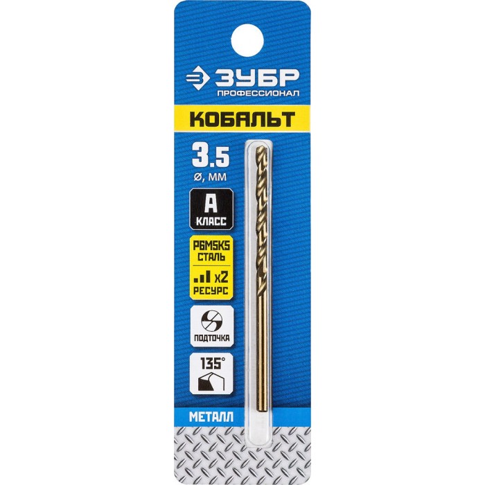 Сверло по металлу 3.5 х 70 мм, сталь Р6М5К5, класс А Кобальт ЗУБР Профессионал 29626-3.5