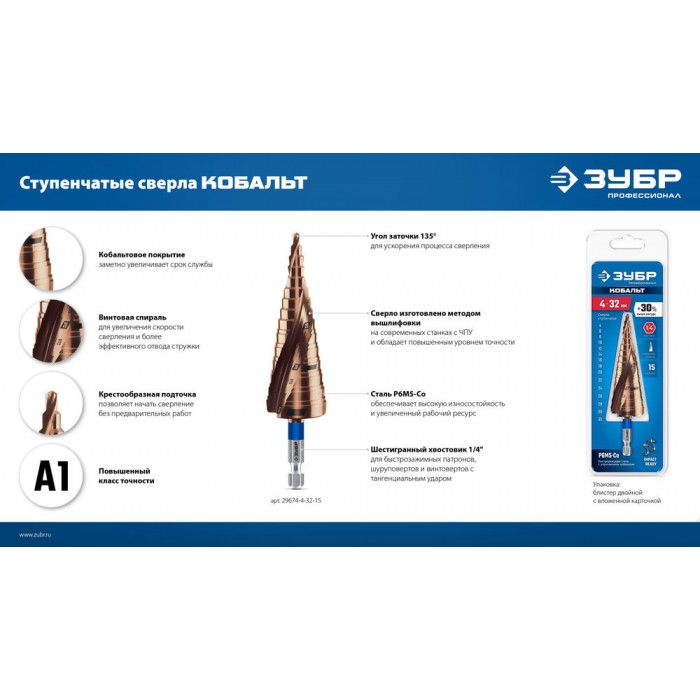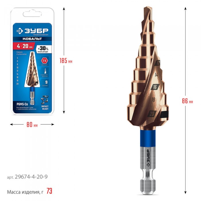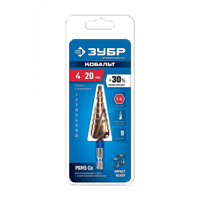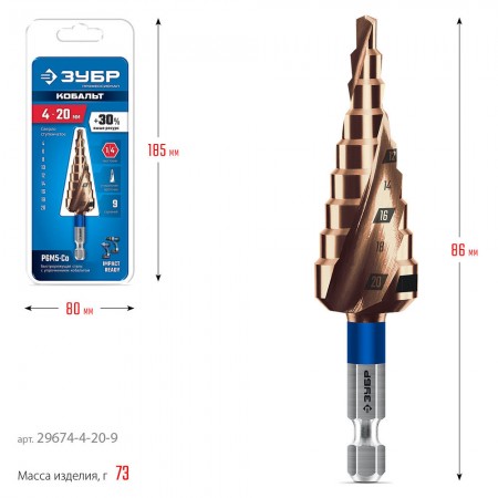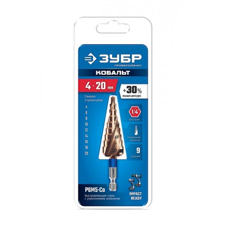 Сверло ступенчатое 4-20 мм, 9 ступеней, винтовая проточка КОБАЛЬТ ЗУБР Профессионал 29674-4-20-9