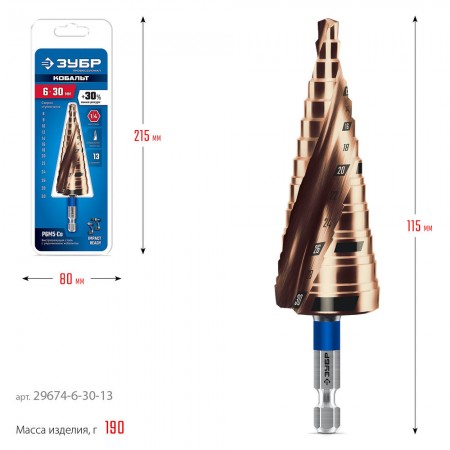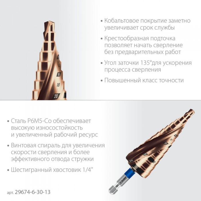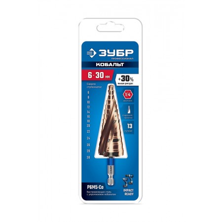 Сверло ступенчатое 6-30 мм, 13 ступеней, винтовая проточка КОБАЛЬТ ЗУБР ПРОФЕССИОНАЛ 29674-6-30-13