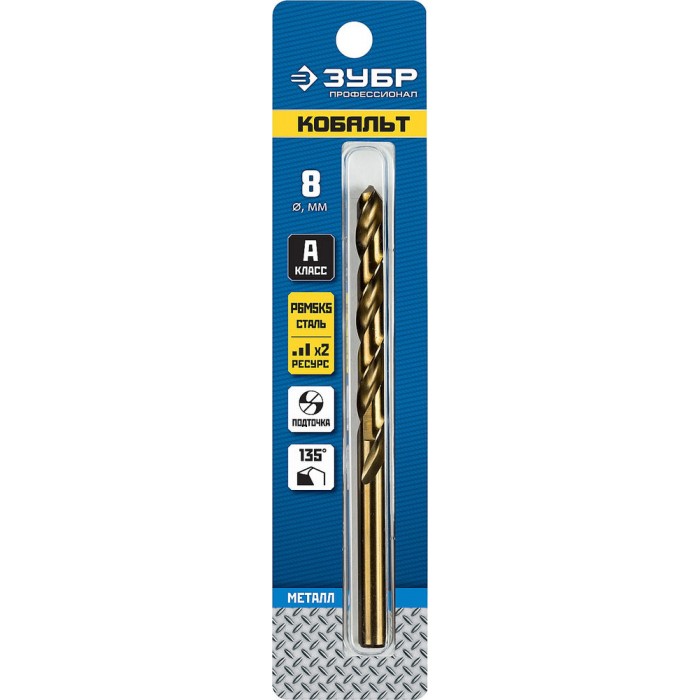 Сверло по металлу 8.0 х 117 мм, сталь Р6М5К5, класс А Кобальт ЗУБР Профессионал 29626-8