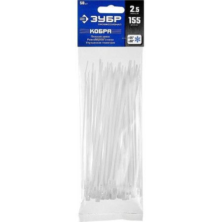 Кабельные стяжки с плоским замком 2.5 x 155 мм, нейлон РА66, 50 шт, белые КОБРА ЗУБР Профессионал 30930-25-155