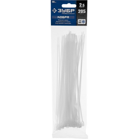 Кабельные стяжки с плоским замком 2.5 x 205 мм, нейлон РА66, 50 шт, белые КОБРА ЗУБР Профессионал 30930-25-205