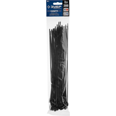 Кабельные стяжки с плоским замком 3.6 x 280 мм, нейлон РА66, 50 шт, черные КОБРА ЗУБР Профессионал 30935-36-280