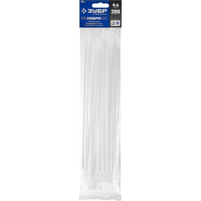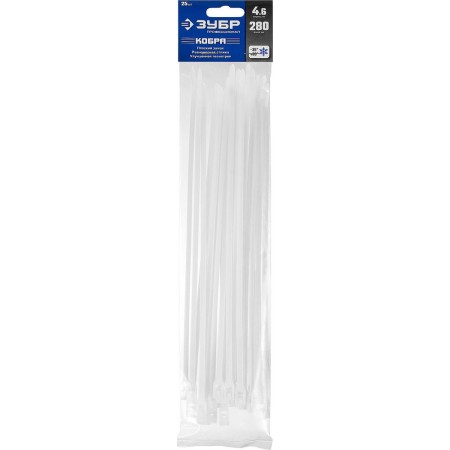 Кабельные стяжки с плоским замком 4.6 x 280 мм, нейлон РА66, 25 шт, белые КОБРА ЗУБР Профессионал 30930-46-280