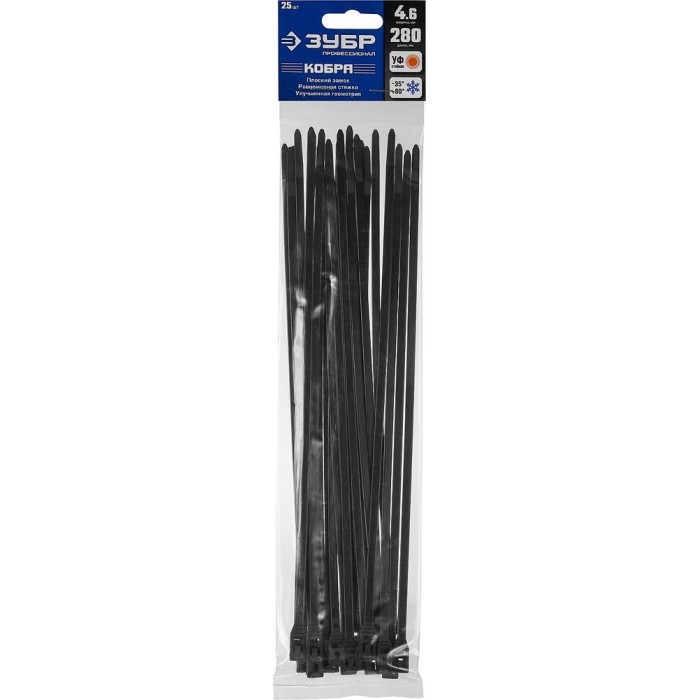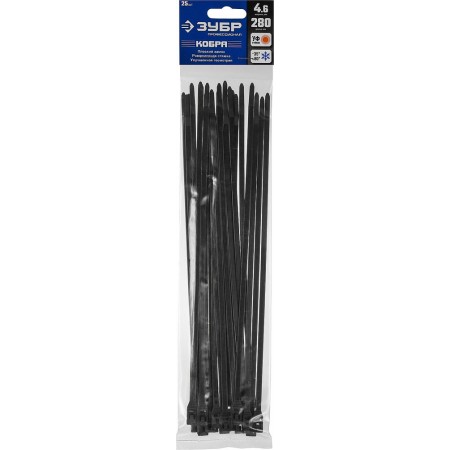 Кабельные стяжки с плоским замком 4.6 x 280 мм, нейлон РА66, 25 шт, черные КОБРА ЗУБР Профессионал 30935-46-280