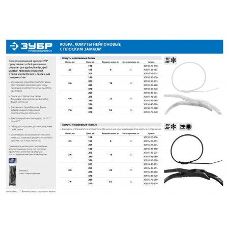 • Диапазон рабочих температур от -35°С до +80°С допускает использование стяжек в самых разнообразных условиях. Монтаж должен производится при температуре от -0°С до +60°С