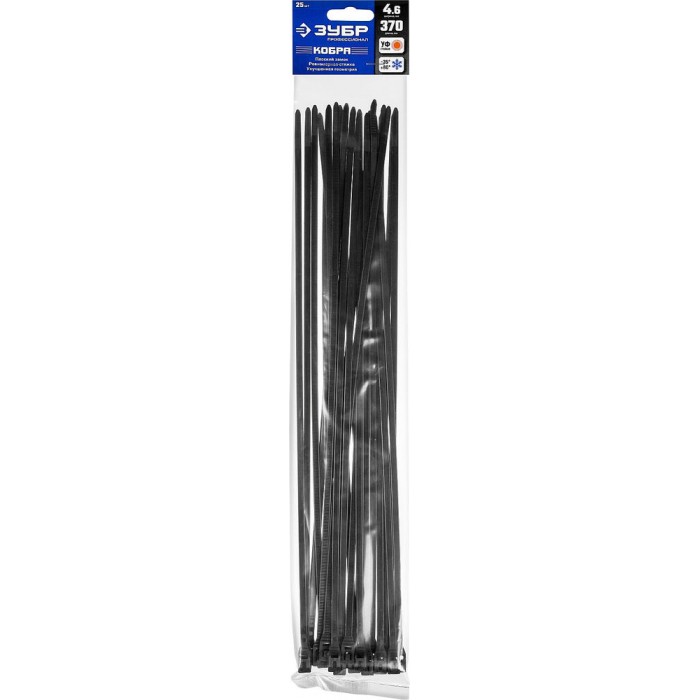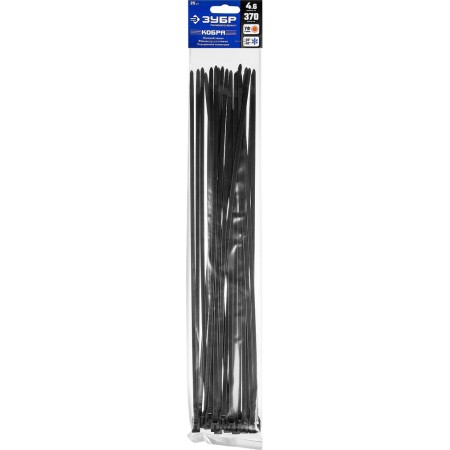 Кабельные стяжки с плоским замком 4.6 x 370 мм, нейлон РА66, 25 шт, черные КОБРА ЗУБР Профессионал 30935-46-370