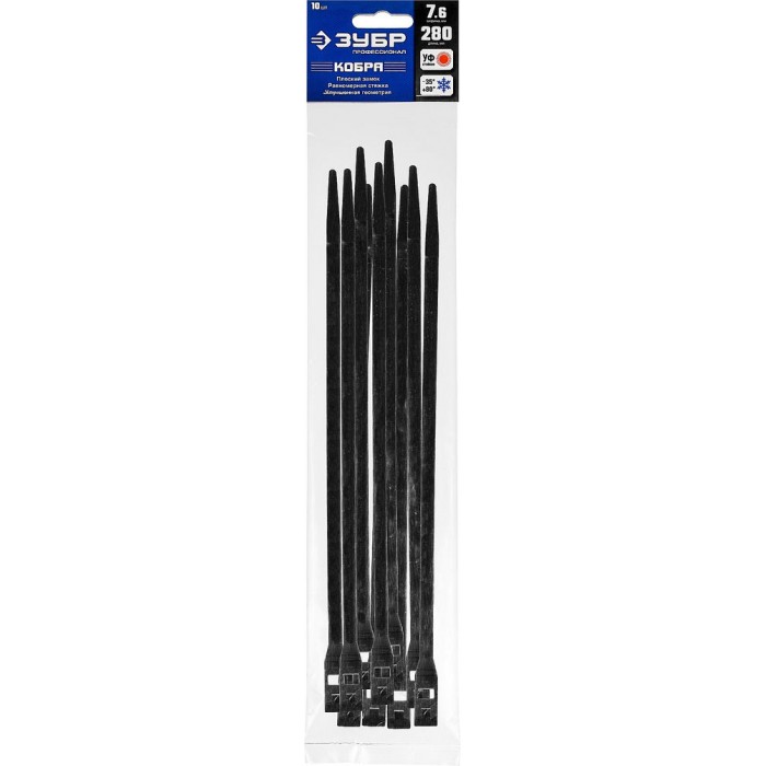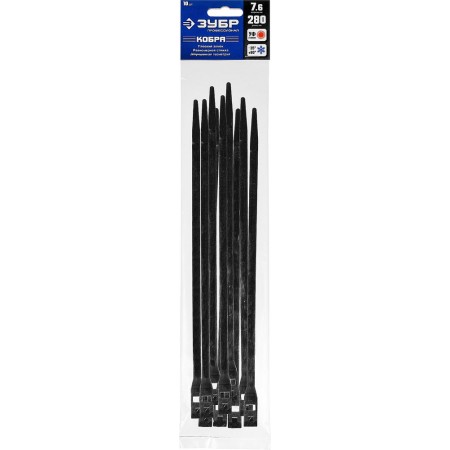Кабельные стяжки с плоским замком 7.6 x 280 мм, нейлон РА66, 10 шт, черные КОБРА ЗУБР Профессионал 30935-76-280