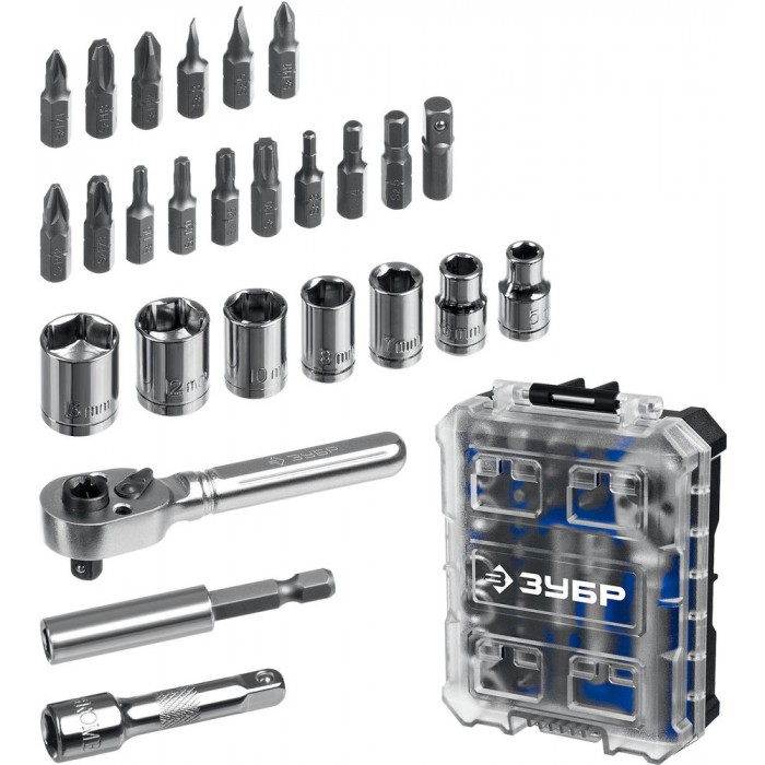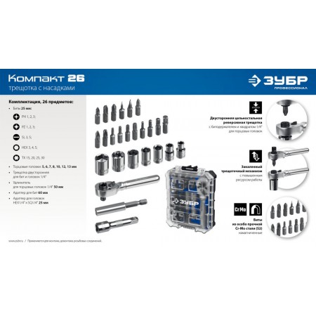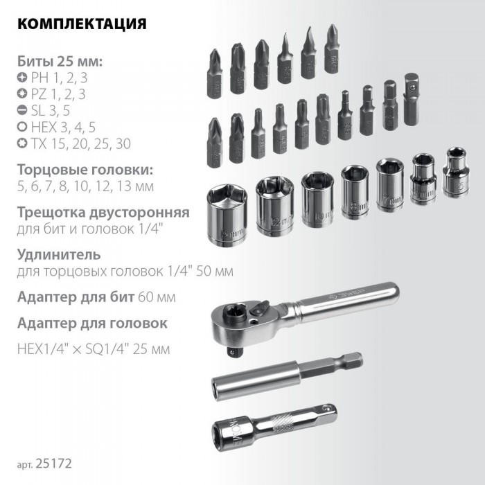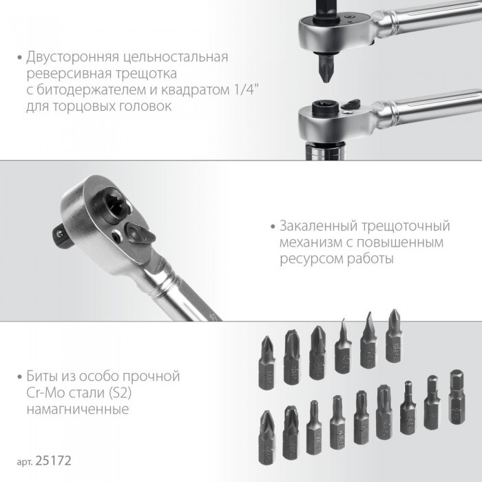 - Двухсторонняя реверсивная трещотка с битодержателем и квадратом 1/4″ для торцевых головок