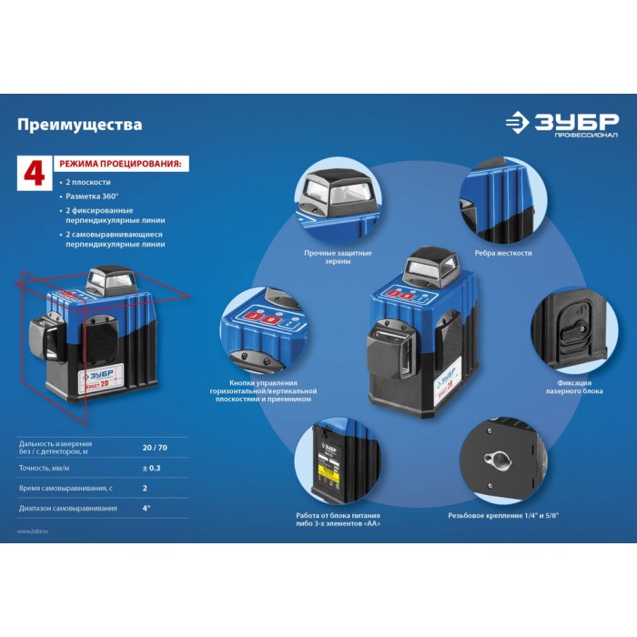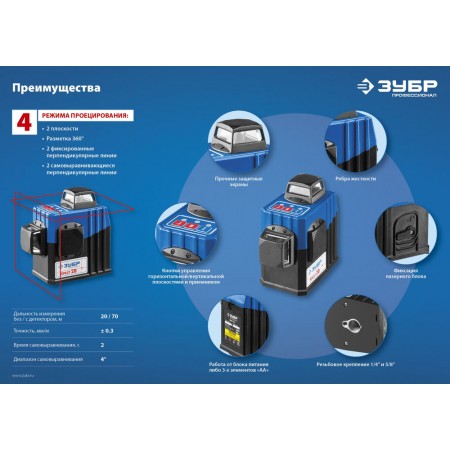 - 2 режима проецирования линий: горизонтальная и две вертикальные линии с развёрткой 360°, благодаря чему луч будет виден в любой точке.