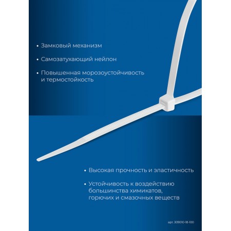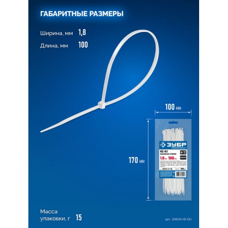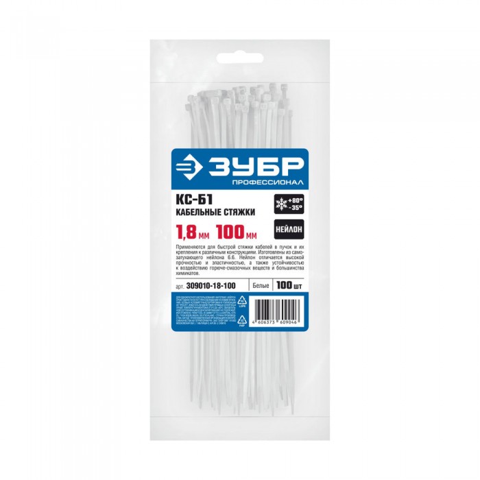 Кабельные стяжки КС-Б1, 1.8 x 100 мм, нейлон РА66, 100 шт, белые ЗУБР Профессионал 309010-18-100